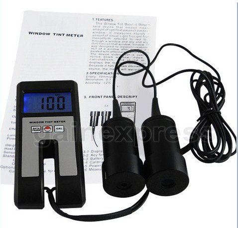 This Window Tint Meter is a hand held device that measures the amount of light that passes through a window. It measures the total amount of Visual Light Transmission (VLT) through a window and any coating (tint film) on that window. This is designed to measure the total VLT of a window after it has been treated with after market window film. The device slides over a partially rolled down window, does its calculations, and in seconds displays the readings on the LCD. Additional features includes continous measuring mode and it has its own internal light source, so the meter will work day or night.